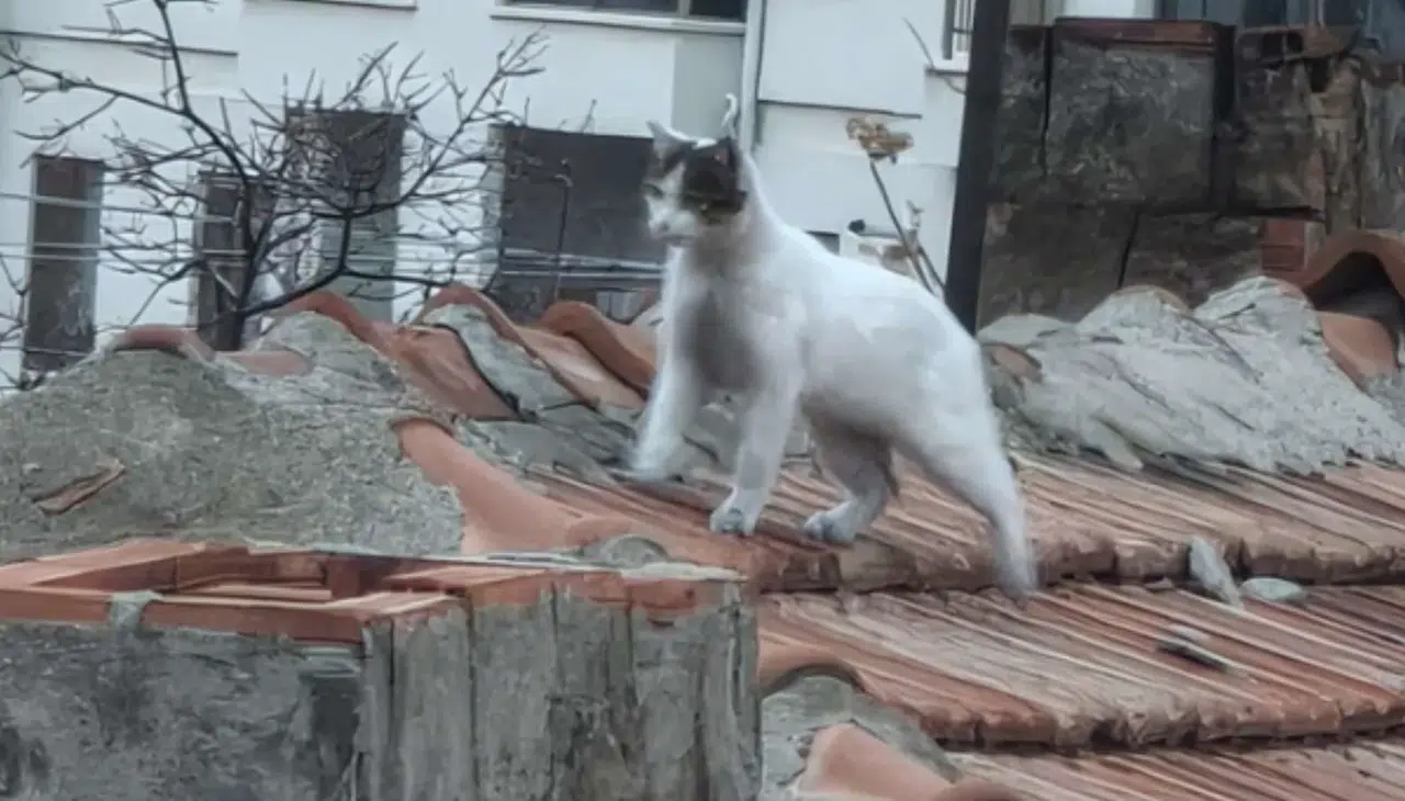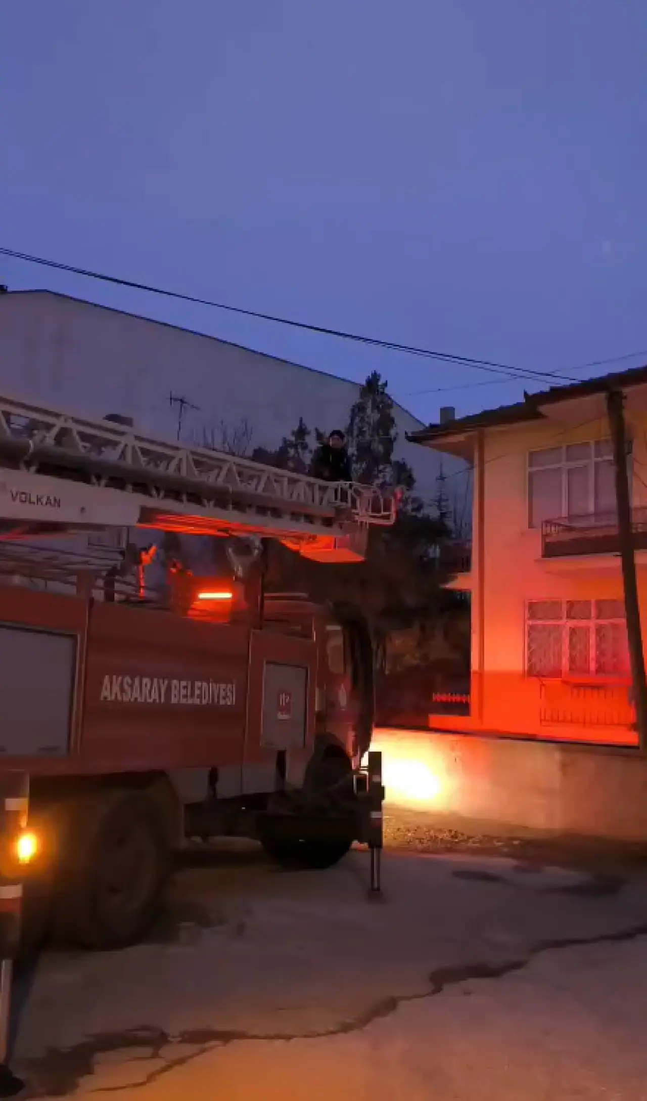 Aksaray’da 2 katlı müstakil evin çatısında mahsur kalan kedi, itfaiye ekiplerinin çalışmasıyla kurtarıldı.