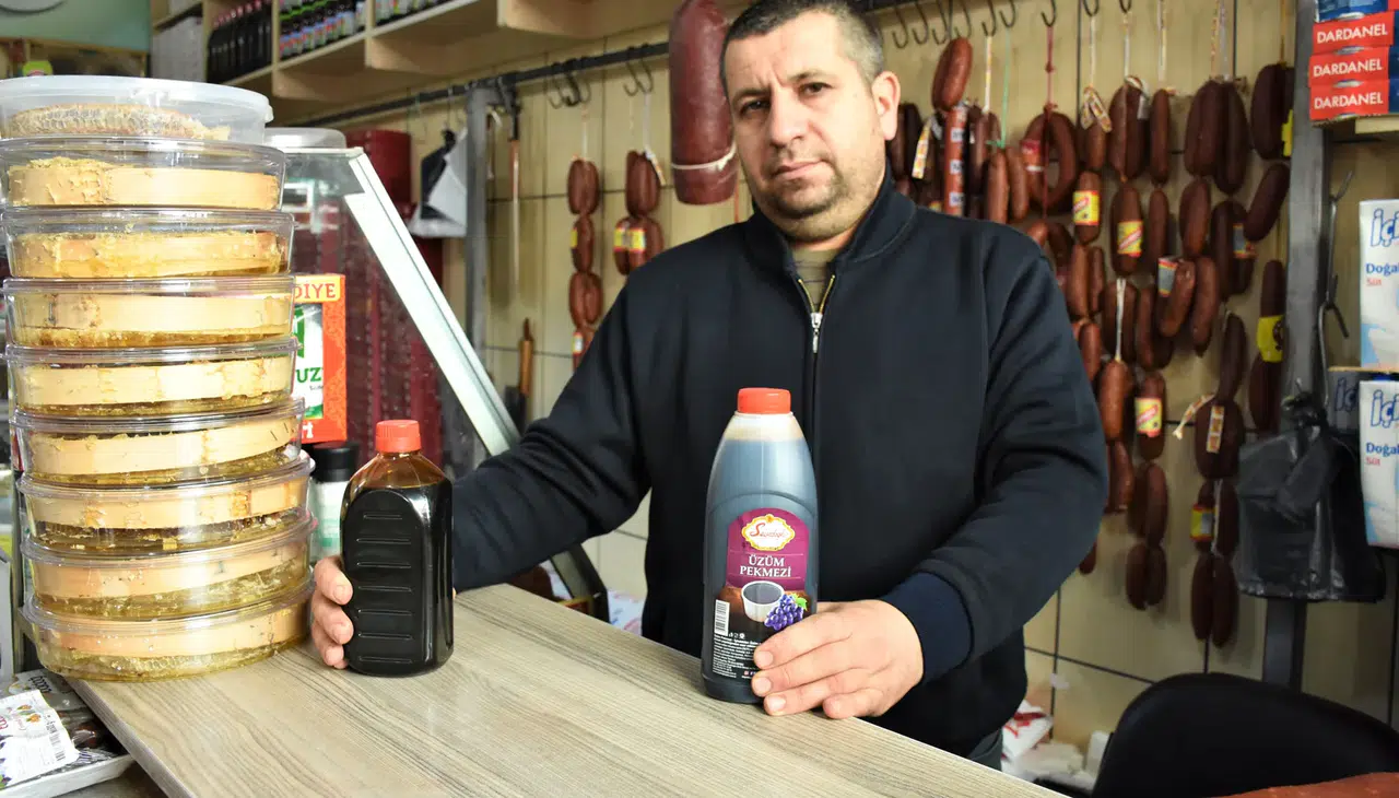 Soğuk kış günlerinde soğuk algınlığı ve hastalıklardan korunmanın en iyi yollarından biri doğal ürünlerle beslenmektir. Bu doğal ürünlerden biri de soğuk kış günlerinin vazgeçilmezi olarak bilinen pekmezdir. Aksaray’da hava sıcaklıklarının düşmesiyle birlikte vatandaşlar pekmeze yoğun ilgi gösteriyor. Kış mevsiminin gelmesiyle pekmez satışlarının arttığını belirten Numune Gıda İşletmesi sahibi Murat Topaç, “Enerji deposu olan pekmeze ilginin her geçen gün artması, son yıllarda değerinin daha iyi anlaşılmasını sağladı. Halkımızın büyük bir çoğunluğu tahin-pekmezi çok seviyor. Pekmez, insan vücudunu dinç ve dinamik tutuyor, enerji açısından da güçlü bir besin kaynağı. Yaz dönemlerinde tahin bulama tercih edilirken, havaların soğumasıyla birlikte tahin-pekmez daha çok tüketiliyor. Üzüm pekmezi ve harnup pekmezi özellikle soğuk algınlığına bire bir ilaç gibi geliyor. Köylerde yaşayan vatandaşlar genellikle üzüm pekmezini tercih ederken, şehirde yaşayanlar ise harnup pekmezine yöneliyor,” ifadelerini kullandı.