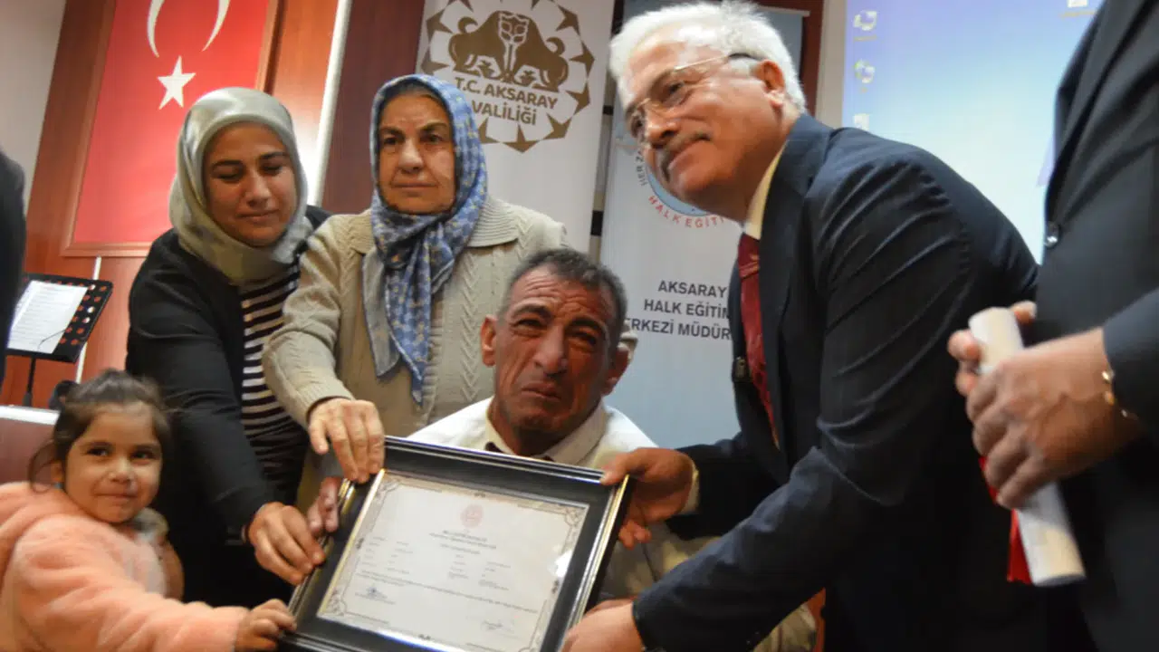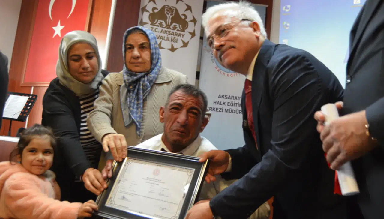 Aksaray’da bedensel engelli Cumali Çağlayan, 44 yaşında okuma yazma öğrendi. Çağlayan, okuryazar belgesini alırken gözyaşlarına boğuldu. 15 Temmuz Milli İrade Meydanı'nda tekerlekli sandalyesiyle tespih satan Cumali Çağlayan, karşılaştığı Aksaray Valisi Mehmet Ali Kumbuzoğlu’na okuma yazma öğrenmek istediğini söyledi. Vali Kumbuzoğlu'nun girişimleriyle Halk Eğitim Merkezi'nde düzenlenen “okuma yazma” kursuna katıldı. İki ay süren kurs sonunda okuyup yazmayı öğrenen Çağlayan, bugün düzenlenen törenle okuryazar belgesini aldı. Belgeyi alırken gözyaşlarını tutamayan Çağlayan, “Okuma yazma öğrenmek isteğimi Vali Bey'e söyledim. O da benim elimden tuttu. Ben de iki ay boyunca azimle Halk Eğitim Merkezi'ndeki kursa giderek okuma yazma öğrendim. Şimdiki hayalim ise yürümek ve bunun için gayret edeceğim” dedi.